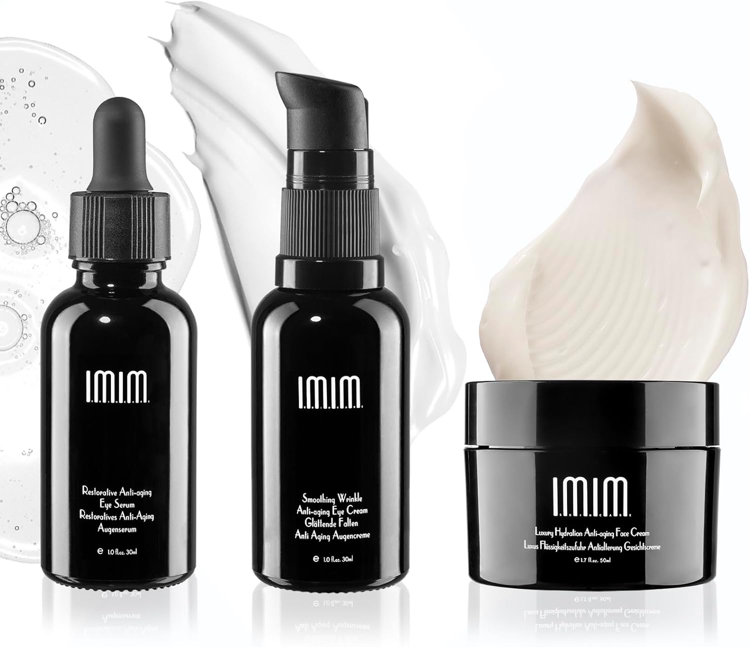 - [Combined Set] IMIM Anti-Wrinkle Set is a combination of anti-ageing products, including Smoothing Wrinkle Anti-aging Eye Cream, Restorative Anti-Aging Eye Serum and Luxury Hydration Anti-aging Face Cream, which effectively fights the signs of ageing on the face, smoothes the eye area and fine lines on the face and increases the skin's self-healing power.